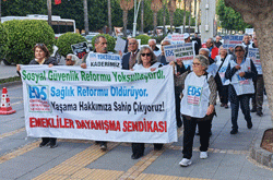 Adana’da emekliler önlükleri ve dövizleriyle, İnönü Parkı’nda toplanıp, Çakmak Caddesi, Özler Caddesi, İnönü Caddesi boyunca, sloganları, alkışları, düdükleriyle tek sıra halinde yürüyerek, emeklilerin insanca yaşamak istediğini haykırdılar. Emekliler Dayanışma Sendikası, Tüm Emeklerin Sendikası ve Devrimci Emekli Sendikası, Adana’nın merkezi caddelerinde insan zinciri oluşturarak tekrar İnönü Parkı’na geldiler. Adana halkının yoğun ilgi gösterdiği yürüyüşte Adanalılar alkışlarıyla, sloganlarıyla emeklilere tam destek sundu. …