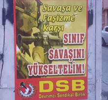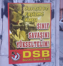 “Savaşa ve Faşizme Karşı SINIF SAVAŞINI YÜKSELTELİM!” yazılı, DSB (Devrimci Sendikal Birlik) imzalı stickerlar yapıldı.