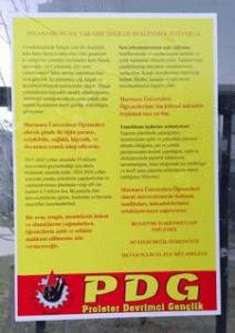 Ayrıca bir süredir artarak devam eden yemekhane sorunlarıyla ilgili, Proleter Devrimci Gençlik imzalı sticker ve duvar gazetesi yapıldı. Yazılan metinde, öğrenci olmaktan kaynaklanan sorunlar sınıfsal bağlamda ele alınarak, üniversite öğrencileri yemekhane işçileriyle beraber örgütlenmeye çağırıldı.