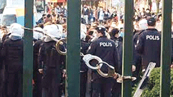 Dışarıda ise, destekçi kitleye saldırıyor polis. Onlar da coplanıyor, sürükleniyor, gözaltına alınıyorlar.