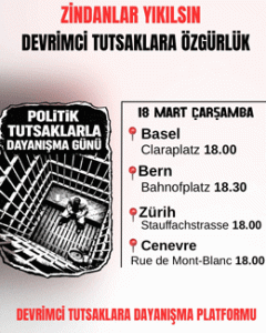 İsviçre’de Devrimci Tutsaklarla Dayanışma Platformu, 18 Mart günü “Dünya Politik Tutsaklarla Dayanışma Günü” dolayısıyla, 4 ilde eylem yapma kararı aldı. Tüm dünyada olduğu gibi Türkiye’de de tecrit ve izolasyonun kuralsızca devam ediyor oluşuna sessiz kalınmaması çağrısı yaptı.