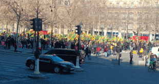 HTŞ’nin Rojava’da gerçekleştirdiği saldırıları protesto etmek için, Fransa’nın başkenti Paris’te eylem yapıldı. Kürdistanlı ve Türkiyeli devrimci-demokrat kurumların çağrısı üzerine yapılan eyleme, yaklaşık 10 bin kişi katıldı. Kürdistan bayrakları ve YPG flamaları eşliğinde Republique Meydanı’nda toplanan kitleyle birlikte, kurumlar da kendi döviz ve flamalarıyla katıldı. Eylemde sık sık “Bıji Rojava”, “Bıji Kurdistan”, “Katil HTŞ” sloganları atıldığı. Fransa PDD